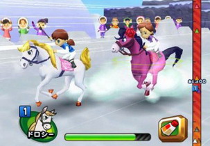 由Bandai Namco Games預定2008年3月6日發售,定价5500日圓的這款Wii主机新作賽馬游戲“家庭騎士”(Family Jockey),本作為1987年在FC主机上發售推出的同名游戲移植重制版,玩家在游戲里將分別使用Wii搖杆跟雙節棍來當作馬韁跟馬鞭,藉此操縱馬 匹,進行最多四人同樂的騎馬競速比賽! 而且游戲內玩家所騎乘比賽的動物除了馬匹之外,另外甚至就連獨角獸、長頸鹿、斑馬、麒麟甚至獅 子等各式各樣充滿個性化的動物也都會一一登場,而且這些動物不但都擁有獨特的各式各樣能力,玩家還可以利用緞帶等裝飾品來裝飾自己的馬匹,在外型上可說是 非常丰富多樣化。另外在本作的賽道上,除了一般平地的賽場之外,另外還有像是充滿南國風情的賽場或是整個覆蓋巨大冰塊的冰世界舞台賽場或是類似萬里長城一 般的古代遺跡賽道也都會在游戲里收錄出現唷! 而且玩家在游戲內,還可以利用能夠在一定時間內提升速度的“黃金蹄鐵”、可以不用耗費氣 力而無限使用鞭子加速的“黃金馬鞭”等各式各樣的道具來妨礙對手或提升速度加速,藉此協助爭奪第一寶座;此外在本作主要的“對戰模式”之外,還有必須從不 斷逼近的“小精靈”身邊設法逃離的“小精靈大作戰”等其他丰富多樣的對戰模式規則,讓玩家可以跟朋友盡情互尬體驗另類賽馬新樂趣! |