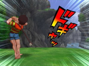 遊戲中登場的高爾夫球場同樣也具備超現實的誇張設計,像是「猿谷高爾夫球場」的第 1 洞,玩家就必須面對將球打到被險峻山谷與湍急溪流隔開的果嶺上的高難度挑戰。 |