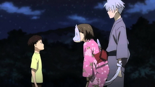 迷路的少女螢無意間進入了妖怪居住的山神森林,遇見了戴著狐狸面具的少年銀。奇異的旅途,就此展開。他們在每年夏日聚首,又分離,然而,彼此間的羈絆卻隨著時間,一點一滴在彼此生命的時間軸上,深深地刻劃下痕跡。但是,唯一可惜的,是螢無法觸碰銀。被施加了法術的銀,被人類觸碰後,便會消失。 被帶離森林的螢問銀,因為過了許久而對方沒有回答時又起了風,螢有些膽怯,匆匆的說明天會帶謝禮過來,轉身就跑開,這時銀才回答。隔天,螢看到在等自己的銀,忍不住興奮而忘記不能碰觸銀而撲了過去,之後螢又被銀用木棒打了一記。從此,螢每年都期待著夏天,每年都期待著能再見到阿銀。年復一年,亭亭玉立的螢與阿銀之間的情愫,逐漸滋長。 在螢剛上高中那一年夏天,銀邀請螢去妖怪的夏日祭典,雖然螢看過妖怪,但是在一大群妖怪中會有些害怕,銀便說我會保護妳的。晚上去赴約的螢和銀一起參加祭典,祭典結束時他們如早上一般,漫步在叢林中,阿銀對螢說話時摘下了自己的面具戴到螢的臉上,隔著面具吻了螢的臉,笑著表示要送給螢面具。 這時有小孩從他們身邊跑過,一個小男孩不小心絆倒,銀出手拉住小男孩的手不讓他跌倒,看著小男孩離開後發現自己的手在發光,螢看到後驚覺那個小孩是人類,銀起初很驚訝,之後微笑的張開手臂標示他終於可以碰觸到螢了,螢跑向銀彼此擁抱並流下眼淚,過不到幾秒,銀消失了,螢抱著銀的衣服痛哭。森林裡的妖怪都很感謝螢,因為銀終於想要碰觸別人,終於可以被擁抱。 |