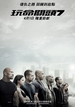 《玩命關頭7》由導演詹姆斯.溫(溫子仁)執導,馮迪索擔任製片,耗資2.5億美金,將由馮迪索、保羅沃克、以及巨石強森以終極狂飆速度帶領所有演員回歸!新加入的角色包括傑森史塔森、吉蒙翰蘇、東尼嘉、龍達魯西和寇特羅素。全球總票房飆破10億美元。 故事發生在唐老大(馮迪索)和布萊恩(保羅沃克)重獲自由一年多後,他們擺脫暗無天日的亡命生活,卻發現這個家脫離現實。唐老大忙著和莉蒂(蜜雪兒羅卓奎茲 飾)重新培養感情,布萊恩則努力跟蜜雅(喬丹娜布魯斯特 飾)和兒子適應郊區生活,泰吉(路達克里斯 飾)和羅曼(泰瑞斯喬布森)倒是實現花花公子的夢想,大肆慶祝得來不易的自由。 可怕的是,他們都沒發現危機伺伏。英國特種部隊殺手戴克蕭(傑森史塔森 飾),正準備為弟弟歐文蕭(路克伊凡斯 飾)報仇。東京的韓哥(姜成 飾)先遭到謀殺,洛杉磯的哈柏(巨石強森 飾)緊接遭暗算。戴克蕭炸了唐老大的家。那個家是玩命團隊重獲自由後,全家人所重返的避風港。在面對戴克蕭的獵殺下,唐需要奪回主動權,此時,美國政府的神秘特務(寇特羅素 飾)提出一項任務,讓彼此之間都能取得共同利益。 這些英雄們打算重操舊業,為美國政府奪回天眼系統,此裝置可以幫他們找到戴克蕭的下落,以免家人再度遭到毒手。玩命團隊再度出擊,有唐老大、布萊恩、哈柏、莉蒂、羅曼、泰吉,他們在片中面臨前所未見的威脅,並遠征阿布達比和亞塞拜然,當然還有他們最熟悉的—洛杉磯街頭。 「玩命關頭」系列後來跨出美國,玩命團隊的足跡在日本、墨西哥、多明尼加、巴西、加納利群島和英國後,到了《玩命關頭7》,重返東京後又轉往阿布達比。片中空中飛車跳機,動員空中攝影師、降落傘配備、安全帽式攝影機、直升機等,成為一大賣點。 片中這次使用超高貴的跑車是Lykan HyperSport定價340萬美元(台幣達1億700萬元),全球僅有7台,採幾何切割風格,線條強壯,0-200km/h加速9.4秒、極速385km/h。 其他出場的跑車還有Chevrolet Camaro Z/28、Subaru Impreza WRX 、Dodge Challenger SRT8 392、1970 Plymouth Barracuda等。 首映以來在美國和加拿大共撈2億9400萬美元,連續3周稱霸北美票房冠軍,《玩命關頭》系列7部電影已破影史紀錄,共海撈33億9000萬美元。
